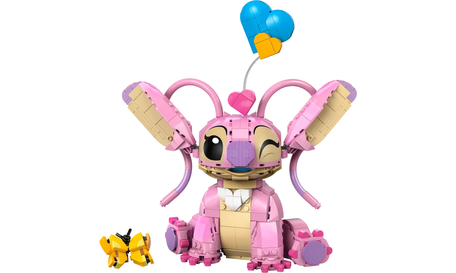 Angyal minifigurája, egy pillangó és 3 „lebegő” szív a külön kapható Stitch-csel való játékhoz és kiállításhoz.