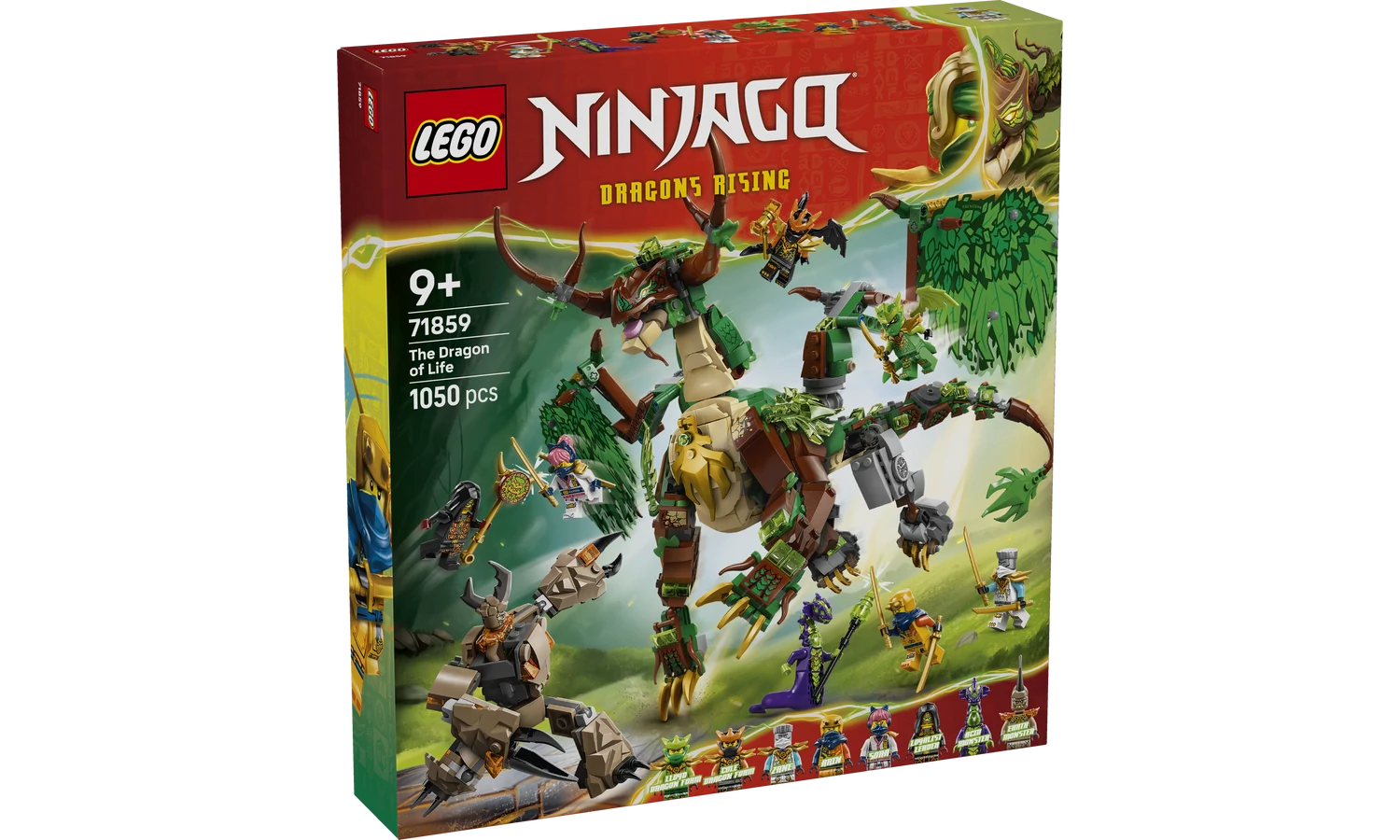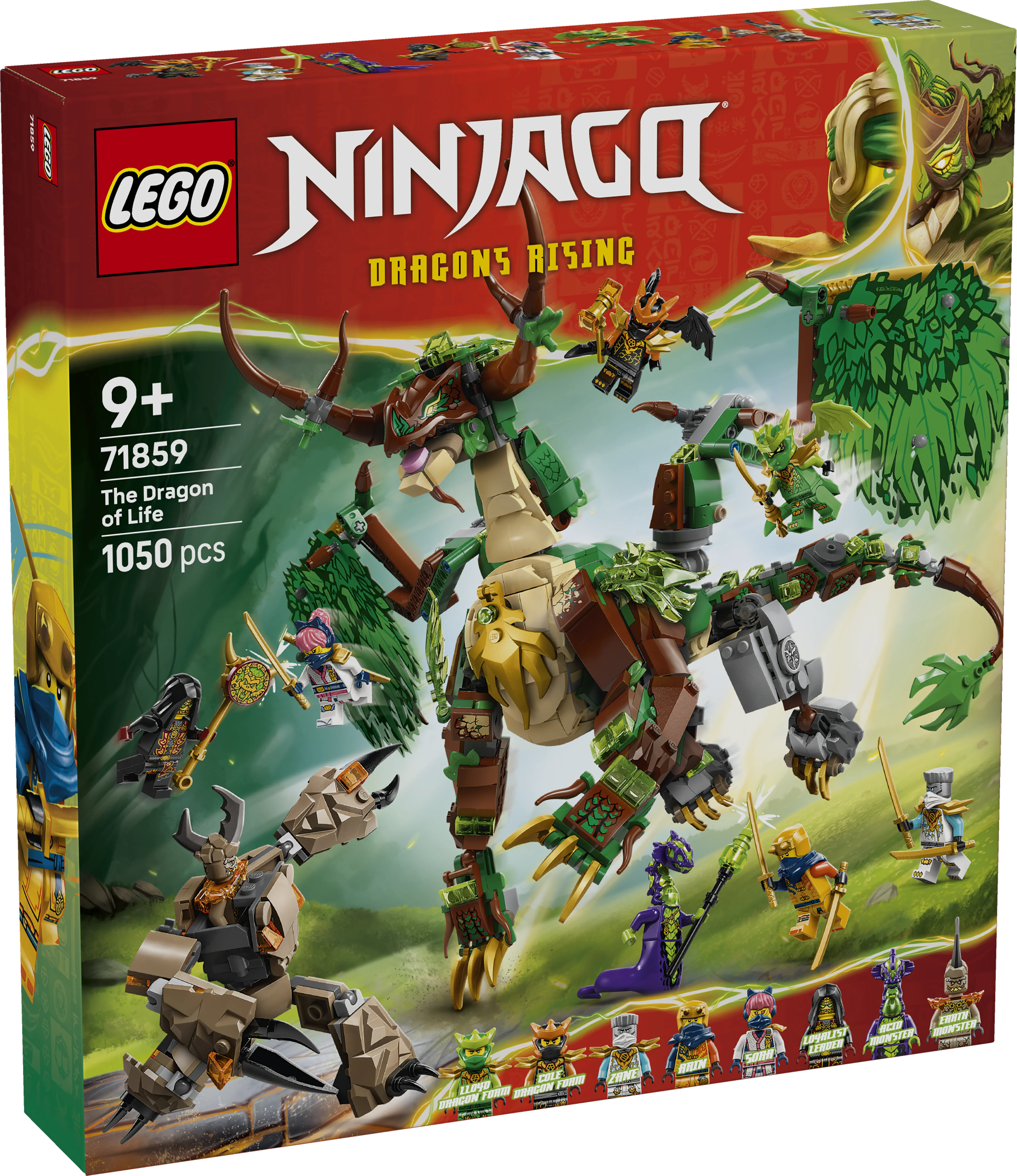 A 9 évesnél nagyobb fiúk és lányok izgatottan fogják összeállítani ezt a LEGO® NINJAGO® Az élet sárkánya (71859) nindzsás játékot, mielőtt újrajátszanák a Sárkányok birodalma című tévésorozat 4. évadának jeleneteit. Ez a játék sárkány szélesre tudja tárni, vagy be is tudja hajtani a szárnyait, valamint állítható állkapoccsal, fejjel, nyakkal, lábakkal, bokával, karmokkal, farokkal és egy minifigura számára kialakított nyereggel is rendelkezik. A játékkészlet tartalmaz egy oldalsó építményt fával és növényekkel, amelyet a gyerekek megforgathatnak, és amely egy arany kardot is rejt, valamint egy mozgatható minirobotjátékot pilótafülkével minifigurák számára. A hatalmas csaták eljátszásához 8 minifigura nindzsa áll rendelkezésre: Zane, Sora, Arin, Lloyd és Cole, sárkányformában, valamint a gonosz trió: a maró szörny, a földszörny és a Lojalista vezető. A LEGO NINJAGO készletek segítségével a nindzsarajongók elmerülhetnek egy fantáziavilágban, ahol nindzsa hőseikkel együtt kreatív játékokat játszhatnak. A LEGO Builder appal a gyerekek magabiztosan építhetik meg a játékkészleteket – felnagyíthatják és megforgathatják 3D-ben a modelleket, valamint nyomon követhetik a haladásukat a könnyen követhető digitális útmutatókkal. A készlet 1050 elemet tartalmaz.
