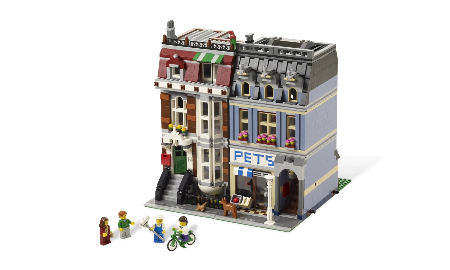 A LEGO® Moduláris Épületek sorozatának folytatása, ez a rendkívül részletes, háromszintes Pet Shop épület és sorház teljes belső és külső részletekkel tökéletes kiegészítője LEGO városának. Köszöntsd az ügyfeleket háziállatok menazsériájával, és engedd, hogy válogatott játékokkal és kellékekkel kedveskedjenek nekik. Az állatkereskedés épületében egy zsanéros lépcsőház található a könnyű megközelíthetőség érdekében, a felső apartman konyhasarokkal és a felső tetőtér az alatta lévő nyitott terű belső térre néz. Oldalt az ízlésesen berendezett sorház egy részletgazdag földszinttel, kiegészítőkkel és csigalépcsővel vezet az emeletre. A tetőtérben tárolódobozok és franciaajtók vezetnek az elegáns előterkélyre, míg a friss zöldségekkel kiegészített tetőkert az épület hátsó részét teszi színessé. 4 minifigurát tartalmaz kiegészítőkkel: állatkereskedés tulajdonosa, kerékpáros lány, festő hengerrel és nő! A Pet Shop kutyát, macskát, 2 papagájt és akváriumot tartalmaz aranyhalakkal! Tartalmaz még 3 kutyacsontot, labdát, békajátékot, madárházat, vödröt és kefét! A konyhasarokban kő kandalló, tűzhely, mosogató, kávéfőző és kis asztal és szék található! A felső tetőtérben tetőablak, ágy és lámpa található! A villában található a földszinten postafiók és posta, kalaptartó, kanapé, telefon, WC és hozzáférés a pincében! Mérete 10" (25,5 cm) széles és 10,5" (26,5 cm) magas!